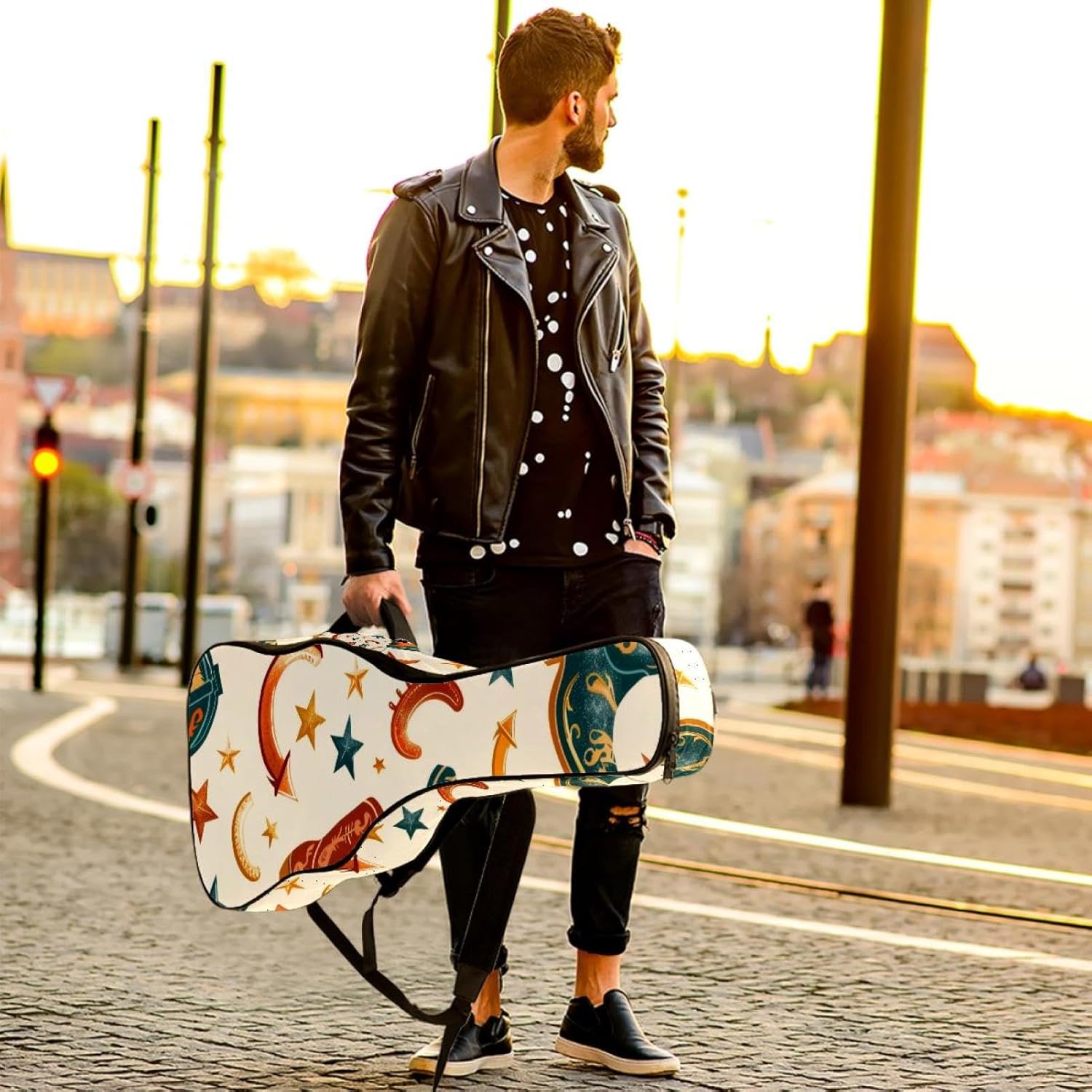 Specifications:Material: waterproof Oxford and waterproof zipper;Size: 42.9’’ x 16.9’’ x 4.7’’, perfect for 40'' 41'' 42'' guitar;Weight:36oz/1020g, lightweight;Color: Multi-color.Features:1. Adjustable backpack shoulder straps and padded side carry handle for more pleasant carrying choices.2. 10mm thick sponge padding inside provide protection for your musical instrument; and fixed Velcro above neck and body keep your acoustic guitar bag safer.3. This guitar bag comes with back hanger loop can be hung on the wall. Save more space when not in use.4. Two pockets for storage convenience, 1 large capacity pocket on outside back and 1 small pocket on the inside neck.5. Cute printed guitar gig bag guitar case backpack, ideal as a gift for your relatives or friends who love music when birthday, Thanksgiving, Christmas, holidays, and other special events.