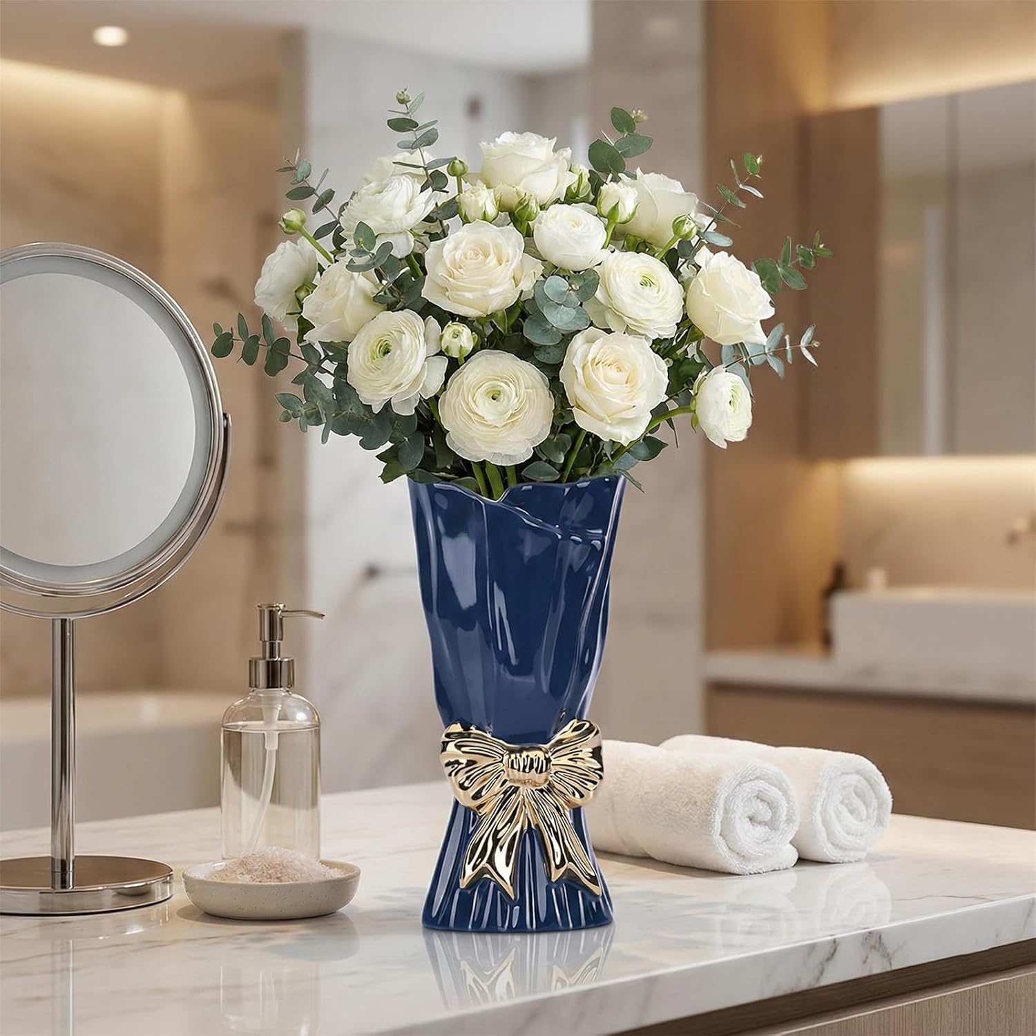 Add a refined statement to your space with this vase with bow—a glossy, sculptural unique vase that instantly elevates everyday styling. The bow detail brings a soft, romantic touch without looking childish, so it works as a cute flower vase and also a truly elegant vase. The wide mouth opening is made for real bouquets: stems fan out naturally, making arrangements look fuller and more intentional. Use it as your go-to bouquet vase for mixed blooms, hydrangeas, or as a vase for long stem roses when you want height and drama. A balanced ceramic build with anti-slip pads helps it stay steady on shelves, consoles, and coffee tables—ideal for shelving decor, entryway table decor pieces, and top shelf decor. Prefer low-maintenance décor? It’s just as beautiful with dried stems and pampas grass, making it a reliable vase for pampas grass and one of those unique vases for flowers you can style year-round. The smooth glossy glaze wipes clean easily, and the wide opening makes rinsing fast after fresh flowers. Place it on a mantel as part of your fireplace mantel decor ideas, or style it as kitchen shelf decorations—a standout piece among trendy vases and modern vases for home decor.