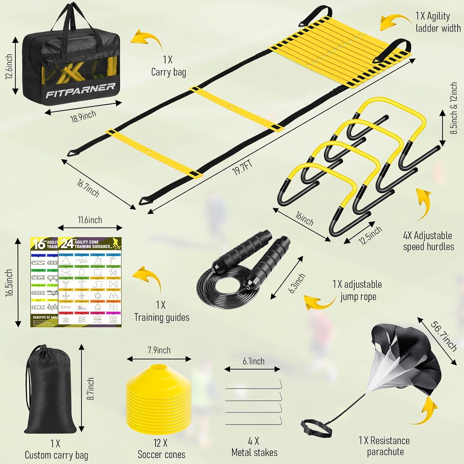 | Included Components | 1*Running Parachute, 1*Training Guides,1*Portable Carry Bag, 12*Soccer Cones,1*Adjustable Jump Rope, 20ft Agility Ladder, 4*Agility Hurdles |