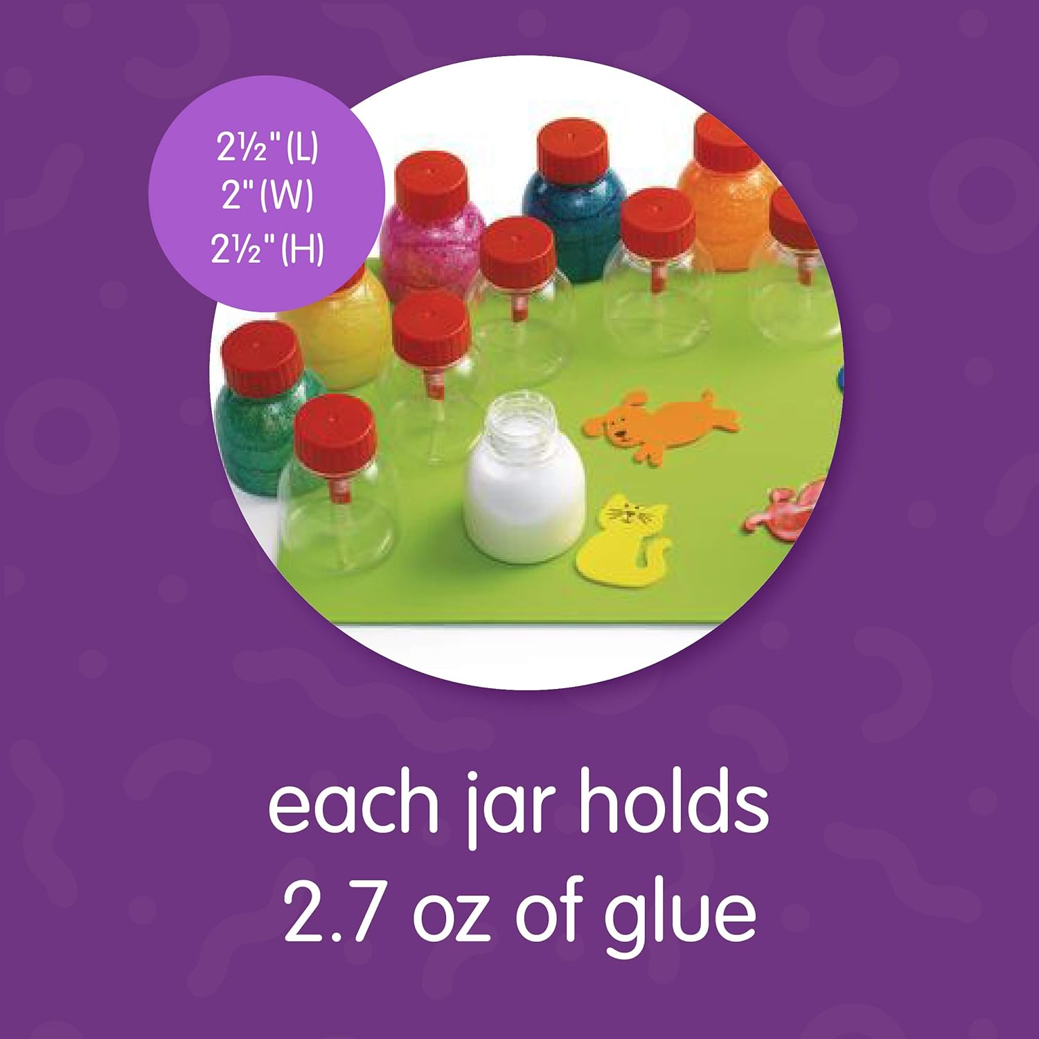 No more smearing glue with your fingers! you'll keep your hands and your work area clean with these convenient glue jars! the application brushes are attached to the inside of their red caps, making gluing a breeze. And you won't have to guess what's in the jars because they're clear. Reusable jars are sold empty in a set of 12 and hold 2. 7 oz. Each. Jars measure 2 5/8 inch H x 2"Dia; cap is 1 1/4 inch W x 2 1/2"L. (Provides the opportunity to Explore and manipulate a variety of art media in a plethora of arts and crafts projects; helps children widen and develop their art skills; try it with mosaics, collage projects, picture frames and poster boards; use when decorating papier-m ché boxes, pencil cups and ornaments; terrific to use for Group art projects) - discount school supply item # GLUEJAR.