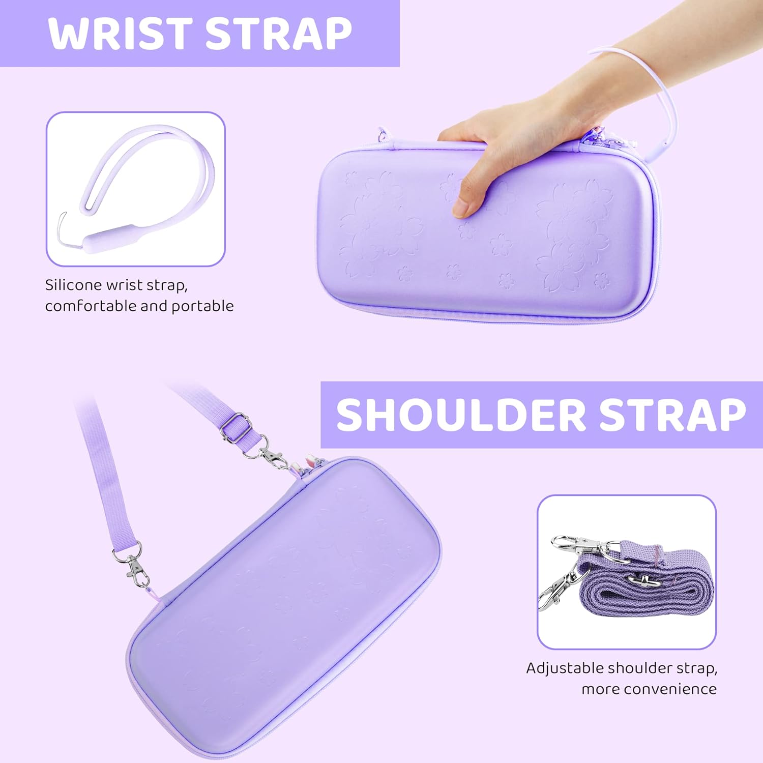 【Feature】Purple Sakura Carrying Case✔Purple carrying case set, cute cherry blossoms✔Upgraded PU material, comprehensive protection✔Full protection, hard outer shell and soft innerPurple TPU Cover✔TPU protective case, not easy to deform✔ Ultra-thin design, dockable✔ Matte coating, more comfortableOther Accessories✔Easy to carry with wrist strap and shoulder strap✔Cute thumb caps to enhance the experience while protecting your joystick✔Glass screen protector, HD【Compatible】Only for Nintendo Switch OLED 2021【Package includes】1 x Purple Sakura Carrying Case1 x Purple TPU Cover1 x Glass Screen Protector4 x Thumb Grip Cap1 x Silicone Wrist Band1 x Shoulder Strap(Excluding Switch OLED and Joy Con controllers)Providing the best quality products and the best customer service is our first principle. If you have any questions, please feel free to contact us.