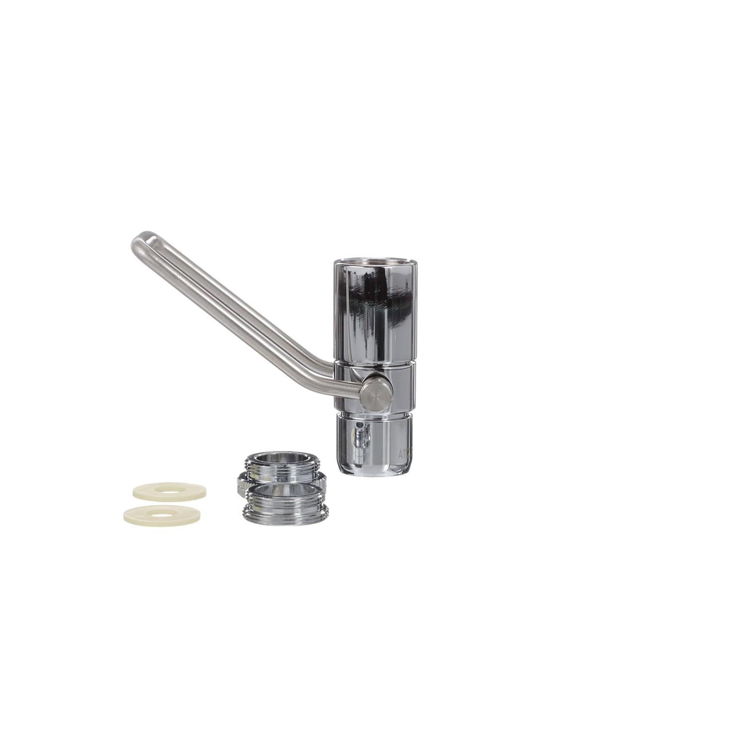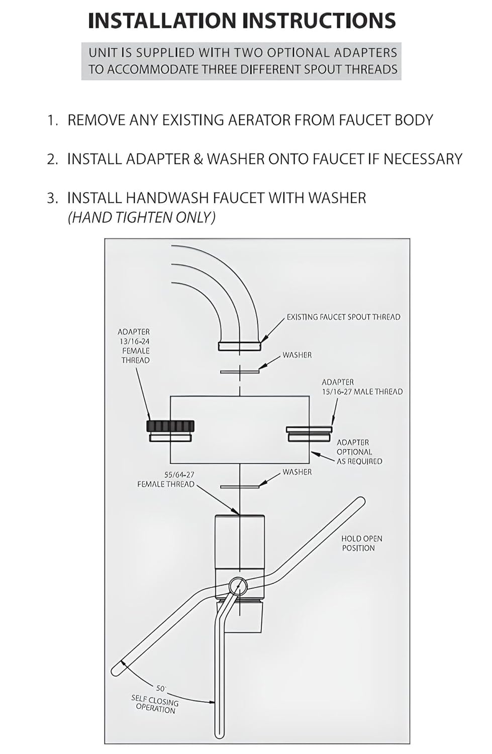Includes a 15/16-27 Male, 13/16-24 Female, and 55/64-27 Female adapters to fit onto virtually any home kitchen or bathroom sink. Compatible with all commercial kitchen sinks, dishwashing sinks, and 3-compartment sinks. This hands-free faucet adapter eliminates the use of faucet knobs with a push lever to begin and stop the water flow of kitchen or bathroom sinks. The automatic closure feature restricts the water flow, saving water and lowering utility bill costs. Features a simple screw-on installation that requires no experience or tools. This sink handwash adapter is spring loaded for automatic closure to restrict the water flow and ensure a sink does not stay running when unattended. Includes a dual position for continuous water flow. Polished chrome brass construction.