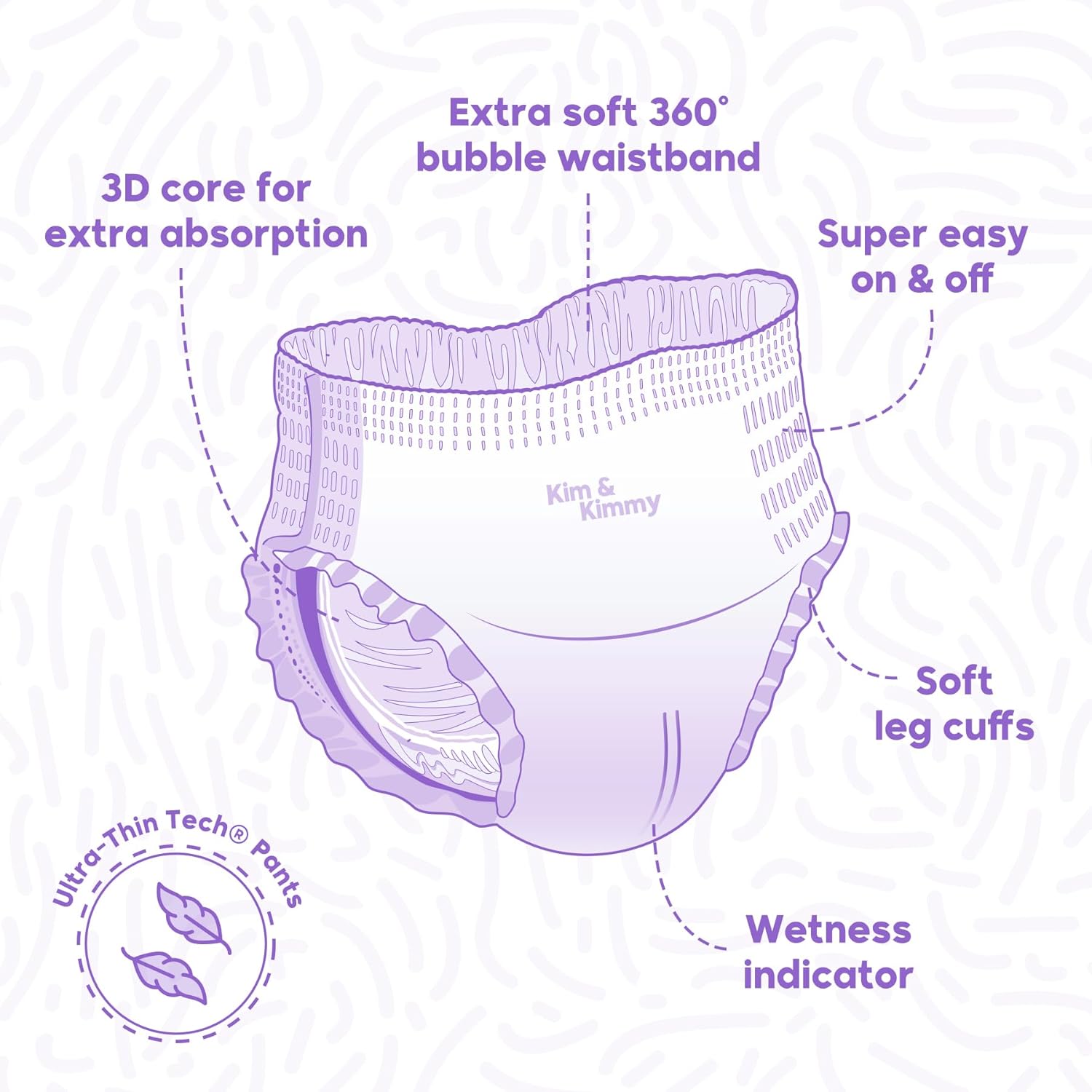 • NO LEAKS! 12-HOUR LEAKPROOF PROTECTION - Kim & Kimmy diaper pants guarantee up to 12 hours of leak-free protection. Our 3D magic leg-cuffs ensure maximum absorption with absolutely no leaking, so you and your baby can enjoy a stress-free night.