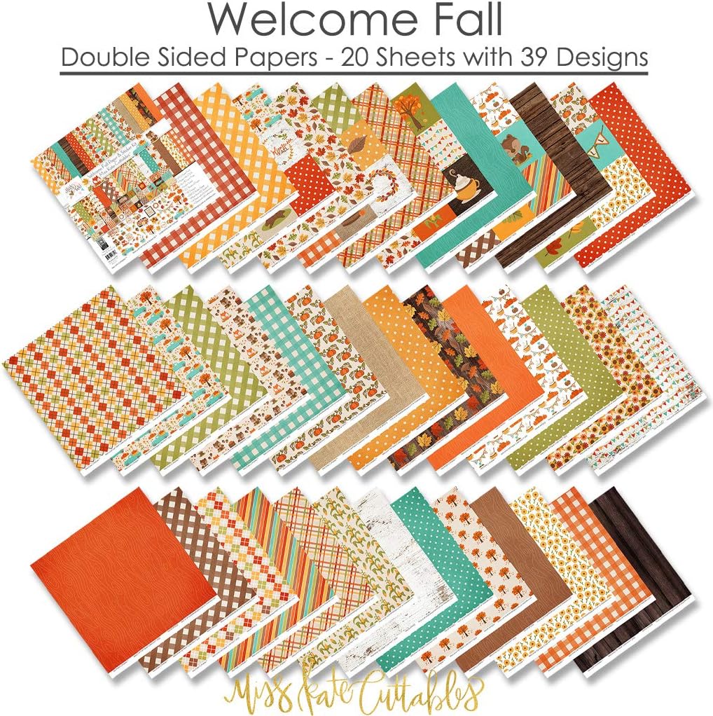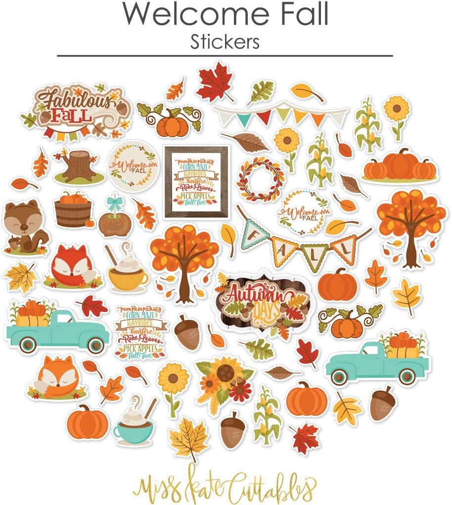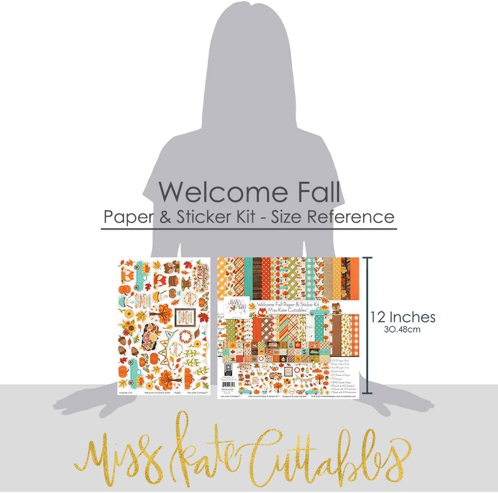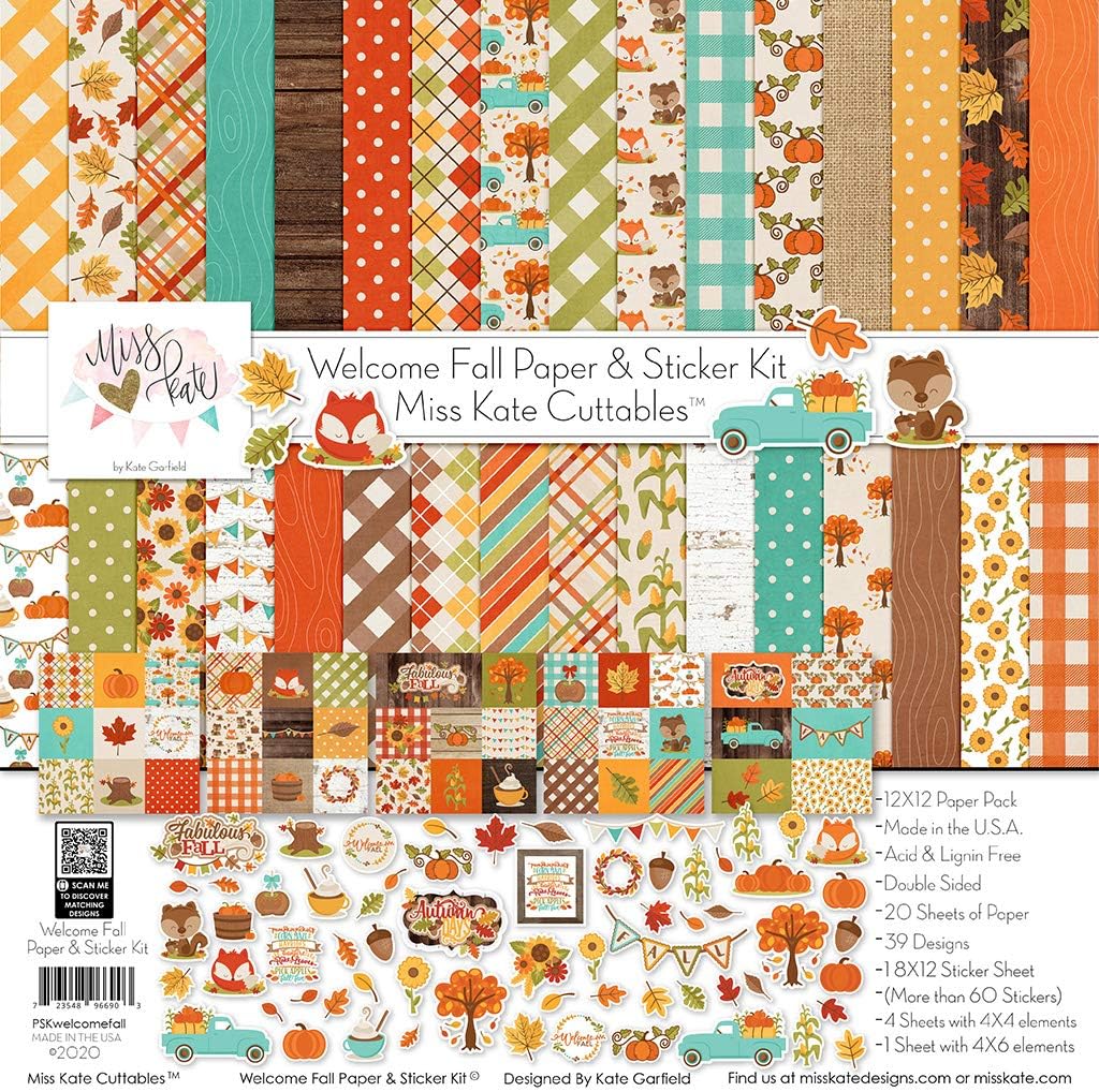 Miss Kate's Paper & Sticker Kit For Scrapbookers, Card Makers, & CraftersAre you always on the lookout for new supplies with cute designs?Then look no further because we’ve got you covered!The Miss Kate Cuttables Paper & Sticker Kit is exactly what you need!About Out PaperWe get lots of questions and comments about the type of paper Kate chooses to print Miss Kate's paper on.Our Bristol sheets provide a stiff, strong surface to work on that is silky smooth to the touch. It is not cardstock and it is not thin paper. The printing has a slight gloss to give it some dimension. We love our paper and think you will too!Paper & Sticker Kit DescriptionThe Welcome Fall Double-Sided Paper has a wide variety of Patterns including autumn leaves, wood themed, diamonds, harvest truck, burlap, pumpkins, festival flags, corn, autumn trees, sunflowers, foxes, squirrels, and solid Backgrounds.The Welcome Fall Sticker Sheet has a wide variety of designs, including "Fabulous Fall" "Welcome Fall" "Pumpkin Picking" "Corn Maze" "Hayrides" "Bonfire" "Rake Leaves" "Pick Apples" "Fall Fun" "Autumn Days" pumpkins, autumn leaves, corn, sunflowers, tree stump, fox, squirrel, autumn tree, harvest truck, hot chocolate, acorns, leave wreath, festival flags, caramel apple and more. THEME: Works with September, October, November, Fall, Autumn, Back to School, Harvest, Cold, Sweater, Pumpkins, Thanksgiving✔ 80lb Premium Specialty Paper✔ 17 - 12"x12" sheets of DOUBLE-SIDED paper✔ 33 Designs✔ 1 - 8"x12" Sticker Sheet✔ Acid and Lignin Free (our paper will NOT damage other things)✔ Archival Quality (beautiful colorful prints that will never fade)
