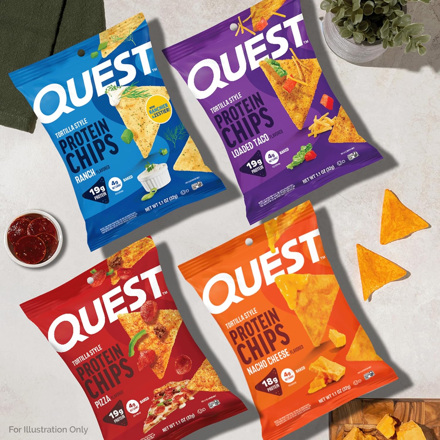 Succumb to crunchy cravings. The Quest Salty Snack Variety Pack features a Pizza Flavor Tortilla Style Protein Chips 2ct, a Loaded Taco Flavor Tortilla Style Protein Chips 2ct, a Nacho Cheese Flavor Tortilla Style Protein Chips 2ct, and a Ranch Flavored Tortilla Style Protein Chips 2ct for even more of the chips you love. And with 18-19g of protein and 4g of net carbs* they’re the ultimate cheat code. Keep a few in your gym bag, desk drawer, or pantry for any moment when you’re craving crunchy, tortilla style chips. Stock up on these delicious gluten free chips and all your other Quest favorites, from bars and shakes - to cookies, candies, and more. Surrender to satisfaction and set your taste buds free. It’s basically cheating. *Per Serving. 5g Total Carbohydrates, 4g Net Carbs. Net carbs = total carbs - dietary fber. Notice: For weight reduction, use only as directed with a prescribed diet plan. Do not use in diets supplying less than 400 calories per day without medical supervision.