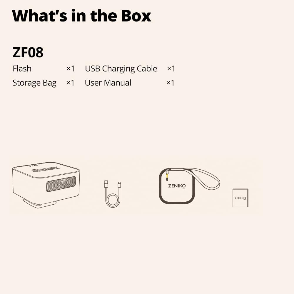 | BuiltIn Media | 1 x USB Cable, 1 x User manual, 1x Zeniko ZF08 Camera flash speedlite (Black), 1x Carrying bag |