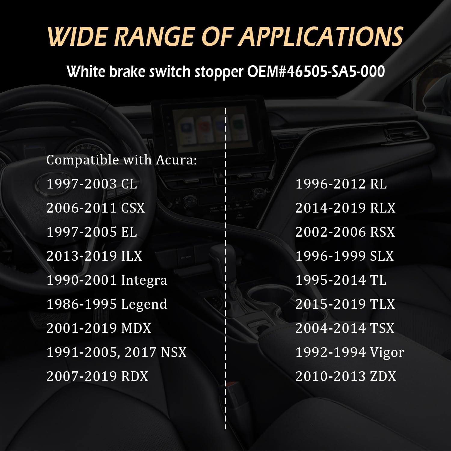 DON'T WASTE A LOT OF TIME AND MONEY! FIX THE BRAKE LIGHTS, JUST USE THESE SMALL CAR ACCESSORIES!🌟[Brake Pedal Stop Pad Dimensions ▨ Black:0.7x0.48 inch ▨ White:0.57x0.57 inch🌟[Brake Pedal Stop Pad Attributes] ▨ Colors:Black+white ▨ Weight:0.4 oz ▨ Material:Premium rubber ▨ Packaging:4x Black brake pedal stop pad, 4x white brake pedal stop pad🌟[Brake Pedal Stop Pad Functions] ▨ Feature:Tight, wear-resistant, precise, and not easily deformed ▨ Function:Fix the issue of the car brake light continuous Illumination🌟[Suitable vehicle]▨ Suitable vehicle of OEM 90541-06036:▨ Compatible with Lexus:1990-1991, 2021-2022 ES2501995-2003 ES3002013-2018, 2020 ES300h2004-2006 ES3302007-2022 ES3502016-2017 GS200t1993-2006, 2018-2019 GS3002009-2011, 2013-2020 GS3502000 GS4002001-2007 GS4302009-2011, 2013-2018 GS450h2008-2011 GS4602010-2022 GX4602003-2009 GX4702016-2017 IS200t2008-2015 IS2502003-2005, 2016-2022 IS3002008-2022 IS3502018-2022 LC5002018-2022 LC500h1990-2000 LS4002001-2006 LS4302010-2017 LS4602018-2022 LS5002018-2022 LS500h2009-2016 LS600h1999-2003 RX3002004-2006 RX3302010-2022 RX3502018-2022 RX350L2006-2008 RX400h2013-2022 RX450h2018-2022 RX450hL1994-2000 SC3001998-2000 SC4002006-2010 SC430▨ Compatible with Scion:2016 iM2005-2016 tC2004-2006 xA2004-2006, 2008-2015 xB2008-2014 xD▨ Compatible with Toyota:1987-2022 4Runner1997-2022 Avalon2000-2022 Camry2000-2005 Celica2000-2022 Corolla1989-1992 Cressida2000-2005 Echo2007-2014 FJ Cruiser2006-2022 Highlander2002-2011, 2013-2021 Land Cruiser2005-2014 Matrix2019-2022 Mirai1988-1989, 1991-1995 MR21995-1999 Paseo1991-1997 Previa2005-2021 RAV42003-2022 Sequoia2001-2008, 2010-2022 Sienna1999-2008 Solara1986-1998, 2021 Supra1995-2022 Tacoma1993-1999 Tercel2000-2021 Tundra2004-2021 Yaris▨ Suitable vehicle of OEM 46505-SA5-000:▨ Compatible with Acura:1997-2003 CL2006-2011 CSX1997-2005 EL2013-2019 ILX1990-2001 Integra1986-1995 Legend2001-2019 MDX1991-2005, 2017 NSX2007-2019 RDX1996-2012 RL2014-2019 RLX2002-2006 RSX1996-1999 SLX1995-2014 TL2015-2019 TLX2004-2014 TSX1992-1994 Vigor2010-2013 ZDX